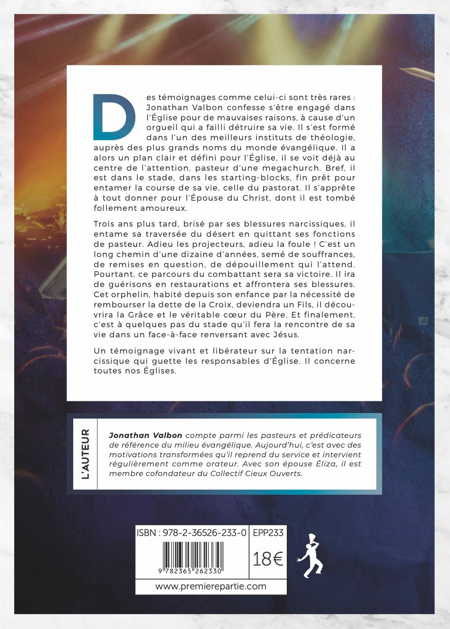 Des témoignages comme celui-ci sont très rares: Jonathan VALBON confesse s'être engagé dans l'Eglise pour de mauvaises raisons, à cause d'un orgueil qui a failli détruire sa vie. Il s'est formé dans l'un des meilleurs instituts de théologie, auprès des plus grands noms du monde évangélique. Il a alors un plan clair et défini pour l'Eglise, il se voit déjà au centre de l'attention, pasteur d'une megachurch. Bref, il est dans le stade, dans les starting-blocks, fin prêt pour entamer la course de sa vie, celle du pastorat. Il s'apprête à tout donner pour l'Epouse du Christ, dont il est tombé follement amoureux.