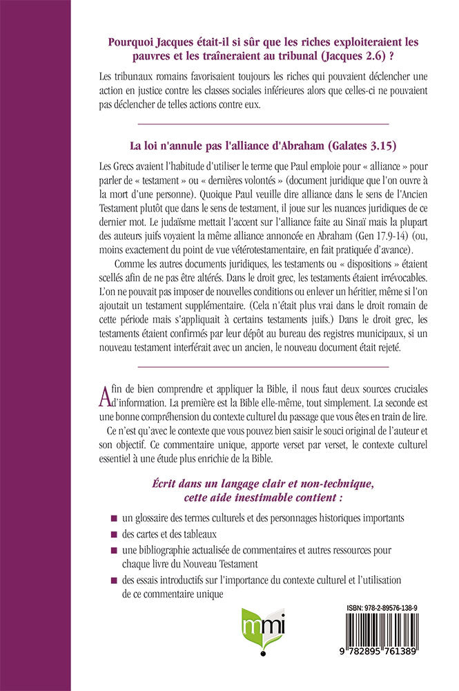 Ce n’est qu’avec le contexte que vous pouvez bien saisir le souci original de l’auteur et son objectif. Ce commentaire unique, apporte verset par verset, le contexte culturel crucial dont vous avez besoin pour une étude plus enrichie de la Bible.