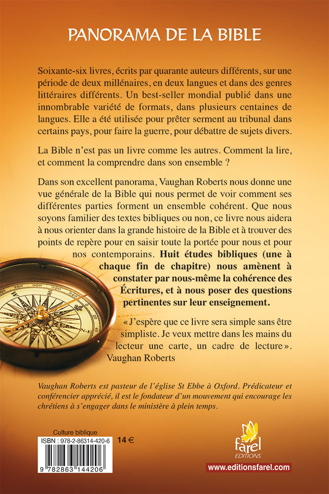Dans son excellent panorama, Vaughan Roberts nous donne une vue générale de la Bible qui nous permet de voir comment ses différentes parties forment un ensemble cohérent. Que nous soyons familier des textes bibliques ou non, ce livre nous aidera à nous orienter dans la grande histoire de la Bible et à trouver des points de repère pour en saisir toute la portée pour nous et pour nos contemporains. Huit études bibliques (une à chaque fin de chapitre) nous amènent à constater par nous-même la cohérence des Écritures, et à nous poser des questions pertinentes sur leur enseignement.